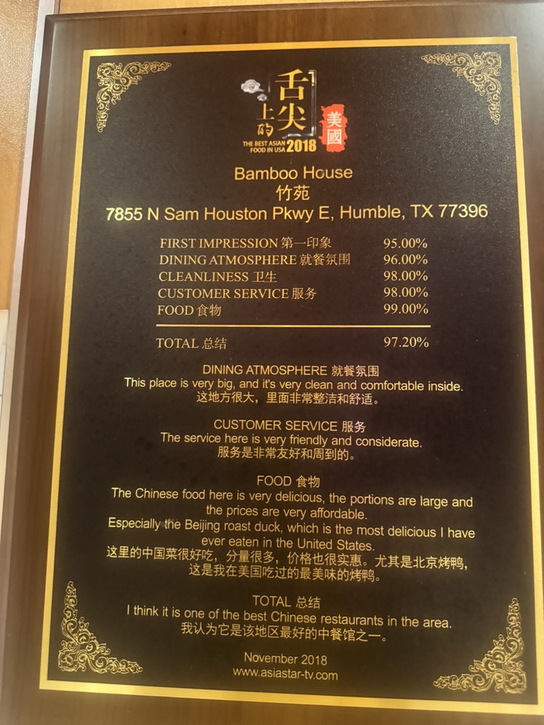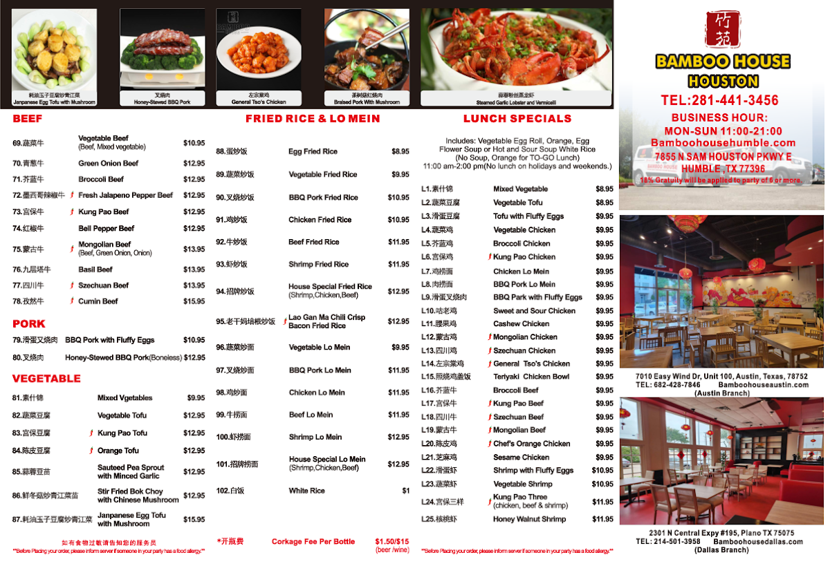 Welcome to Bamboo House Humble, an authentic Chinese dining gem located at 7855 N Sam Houston Pkwy E, Humble, TX. Renowned for its **generous portions** and **reasonable prices**, this restaurant excels in offering a delightful culinary experience. The menu features a variety of dishes, with the **Peking Duck** often highlighted as a must-try. Customers rave about its crispy skin and savory dipping sauces, making each bite a memorable one.